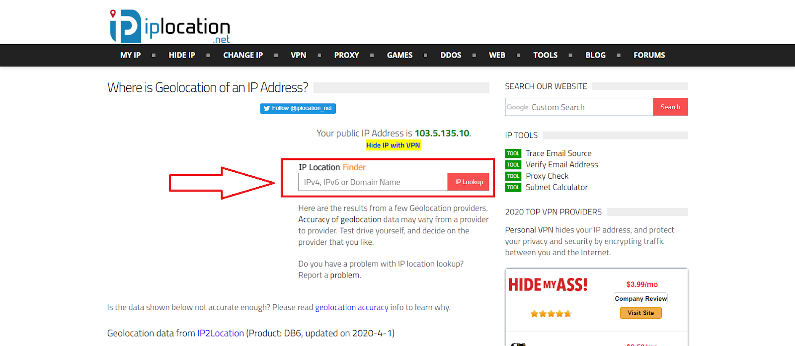 Now you should copy the IP address. Then click IP tracker. In the IP tracker home page paste the IP address into the box that says IP location finder, and click IP lookup.